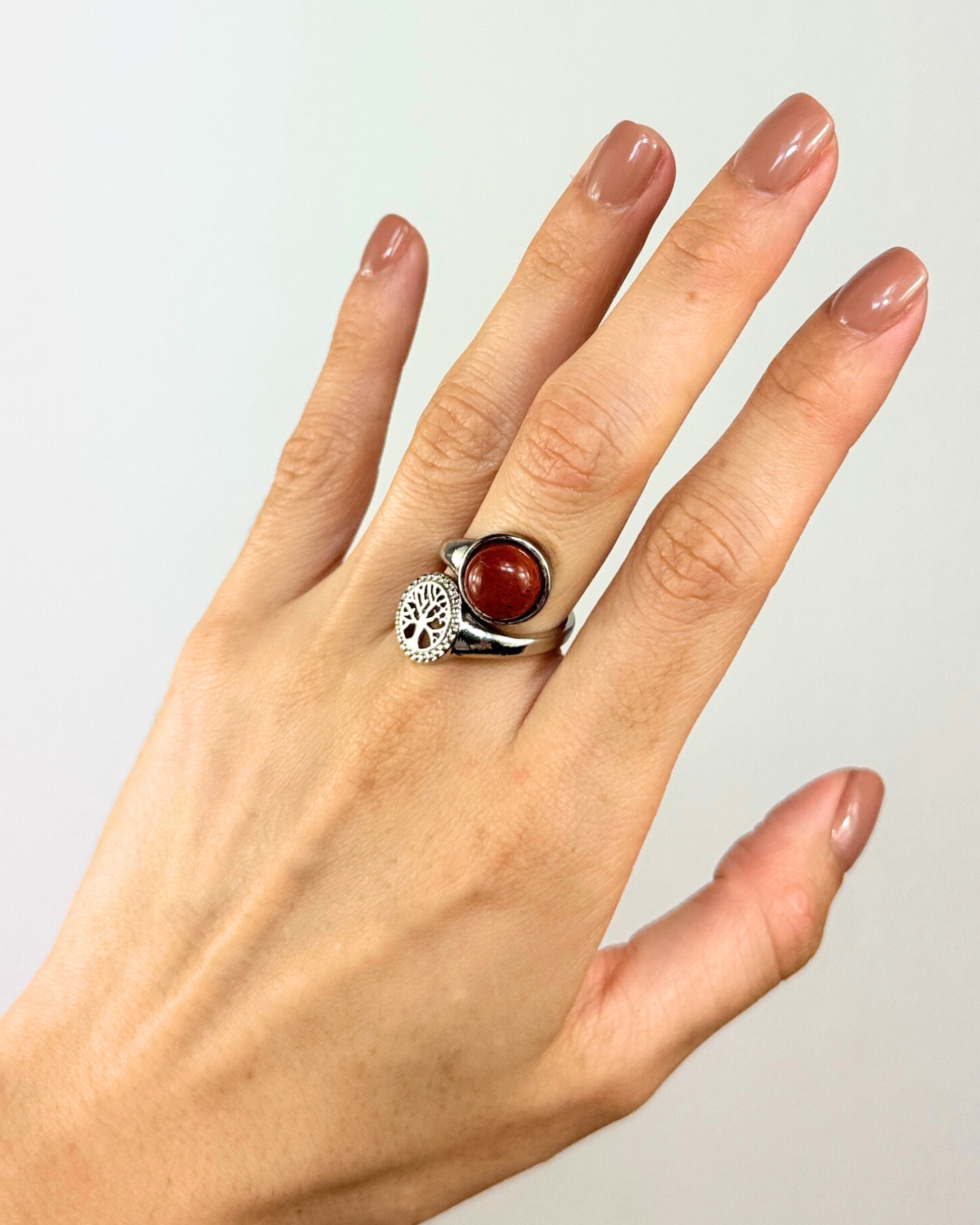 Este anillo es un recordatorio de fuerza vital y estabilidad. El símbolo del Árbol de la Vida representa las raíces firmes y la conexión con la tierra, mientras el Jaspe Rojo enciende la pasión, la valentía y el impulso de avanzar.