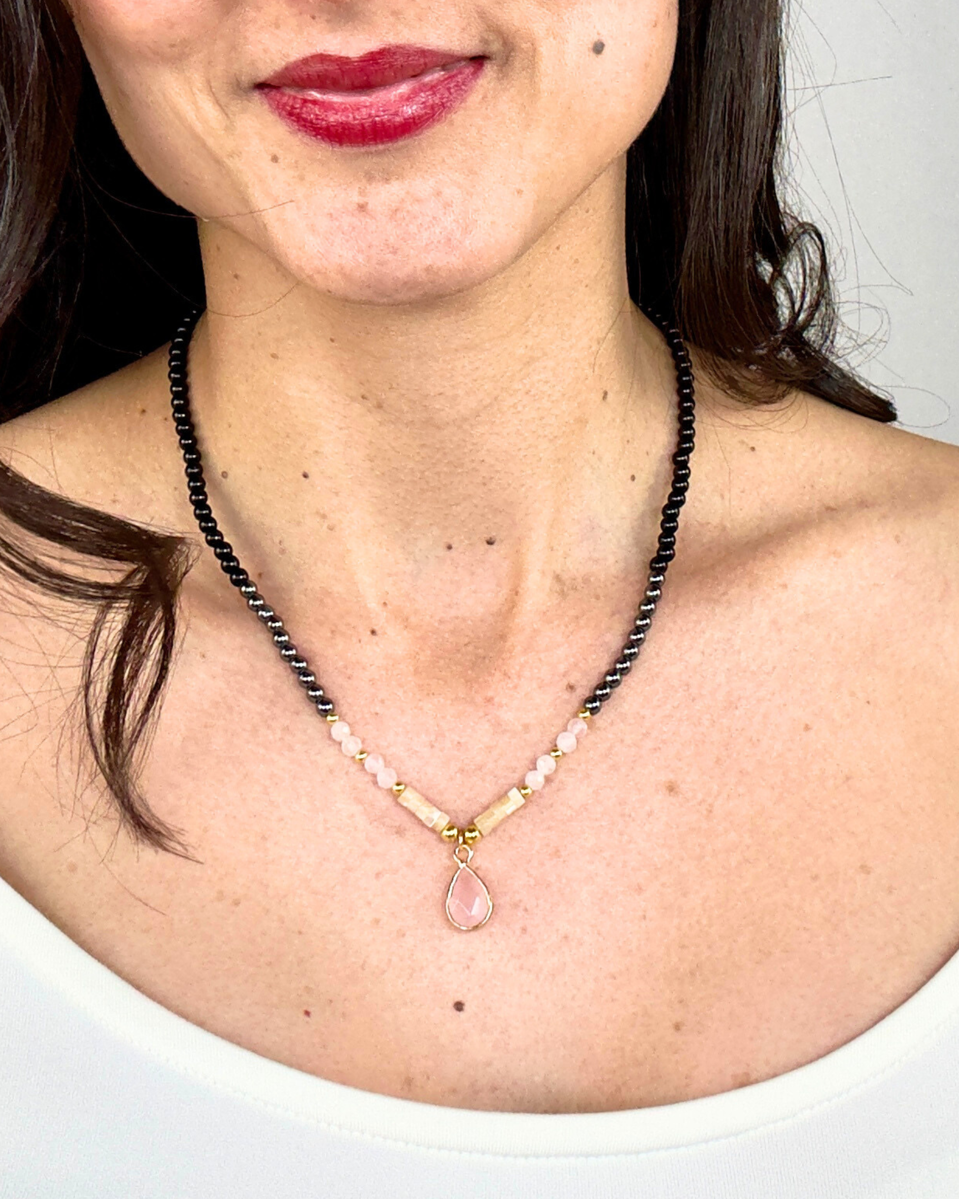 Ancla de Luz con cuarzo rosa es una joya de sostén emocional y autocuidado consciente. La combinación de obsidiana y hematita aporta protección y seguridad, mientras el cuarzo rosa abre el espacio del corazón desde la suavidad.