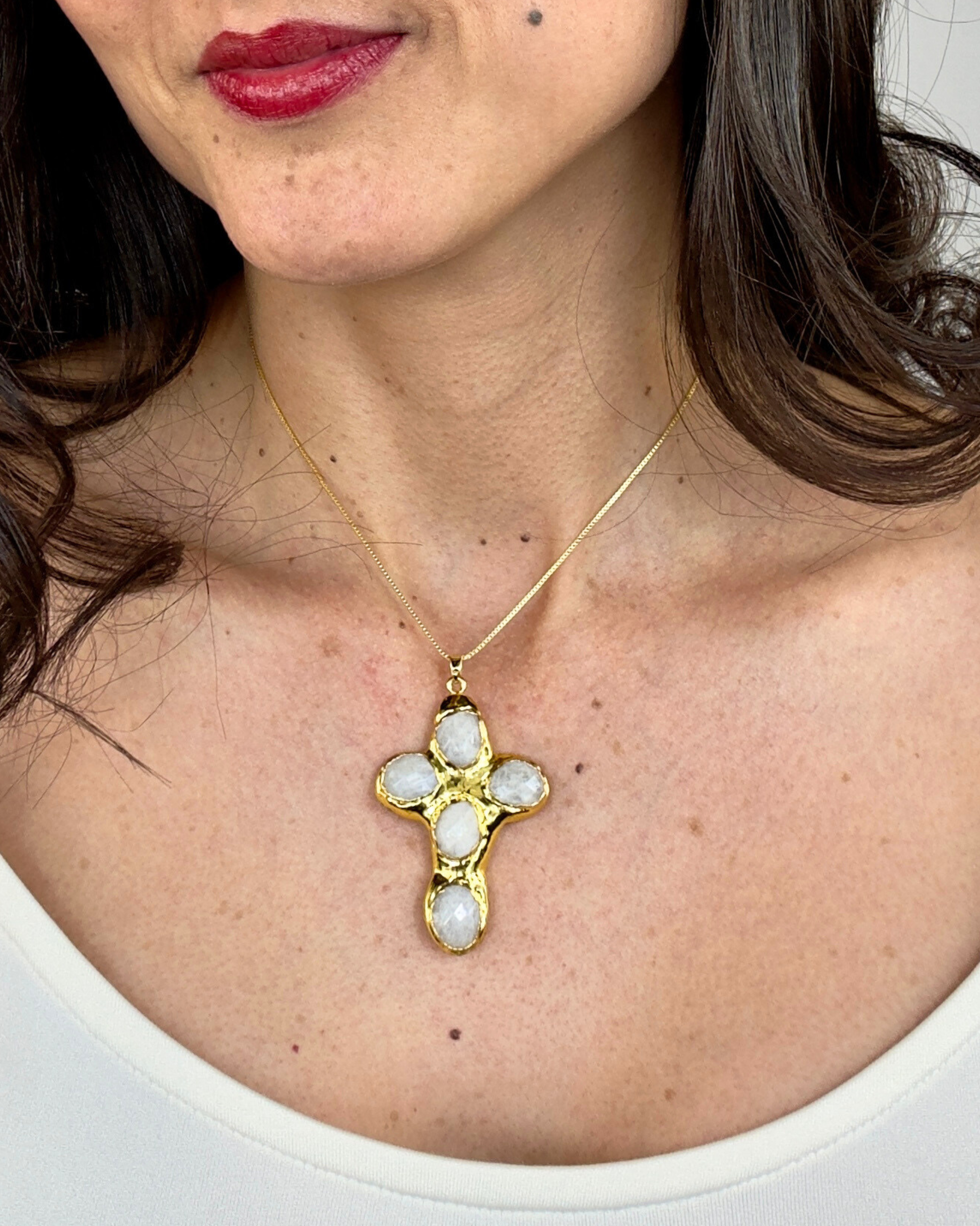 Portal Lunar es una joya de piedra luna en forma de cruz, símbolo de equilibrio, protección y encuentro entre los distintos planos del ser.