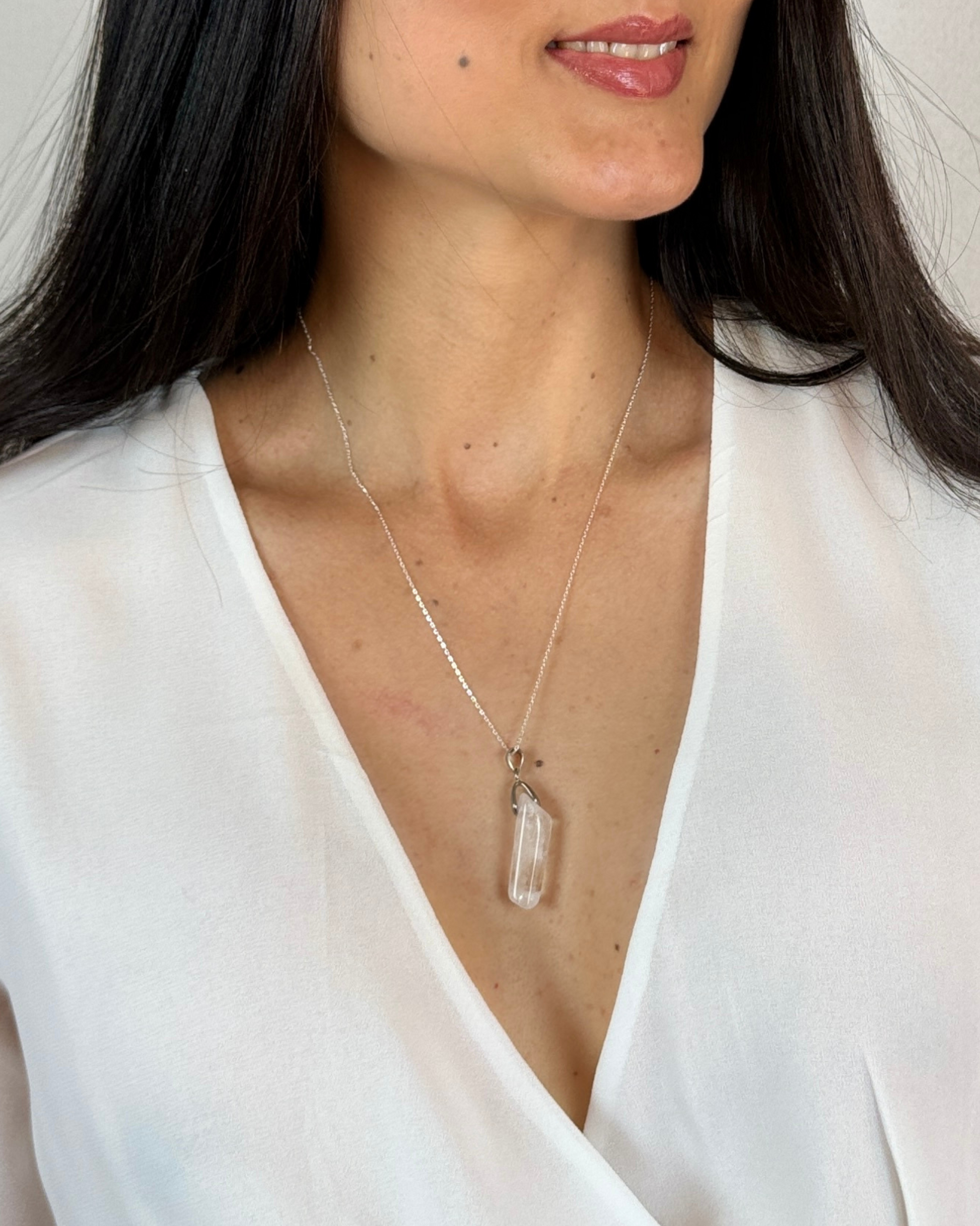 El cuarzo cristal es un canal de energía limpia, transparente, expansiva. Este collar amplifica tus intenciones y conecta con tu verdad más pura.