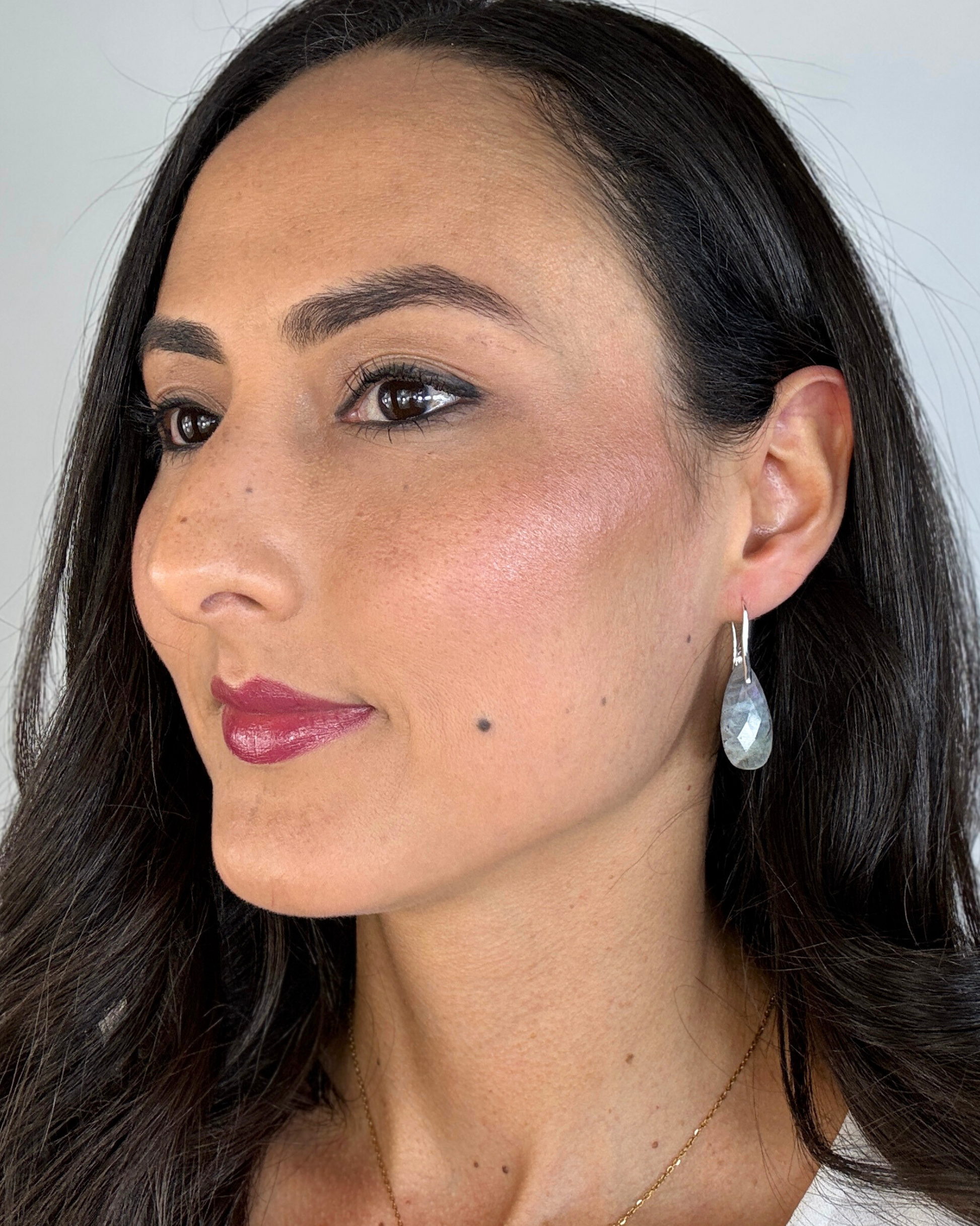Los pendientes Alba de labradorita son un talismán de misterio y transformación. Su piedra natural facetada revela destellos tornasolados que cambian con la luz, despertando la magia interior y la creatividad.