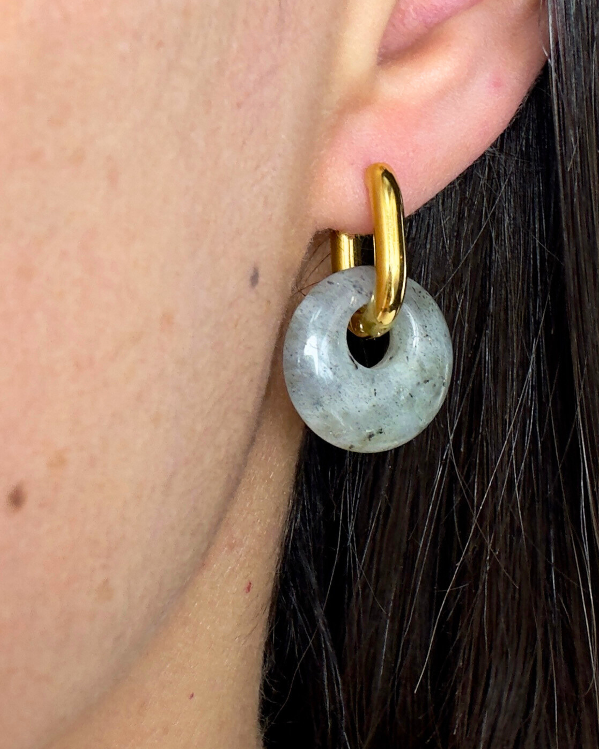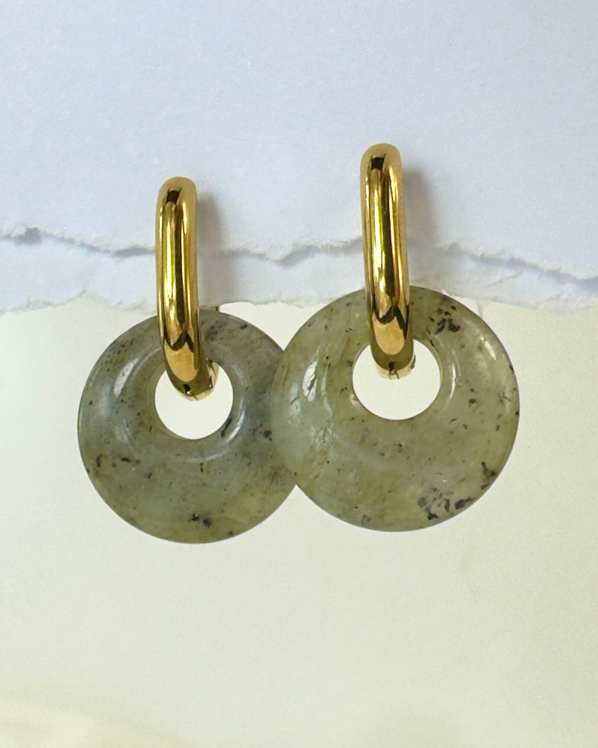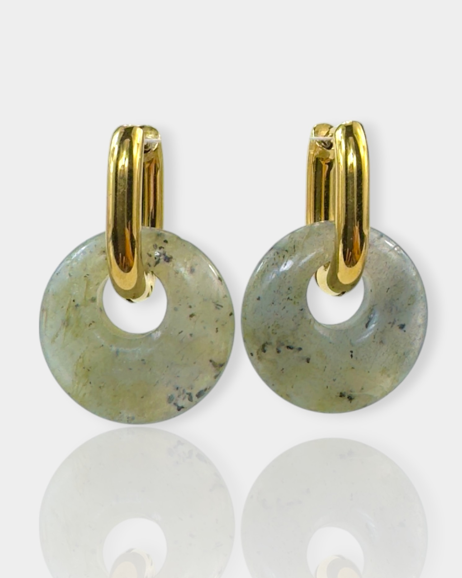 Los pendientes Círculo de Luz con Labradorita despiertan tu intuición y protegen tu energía. Este mineral mágico refleja destellos de transformación y te guía en procesos de cambio interior.