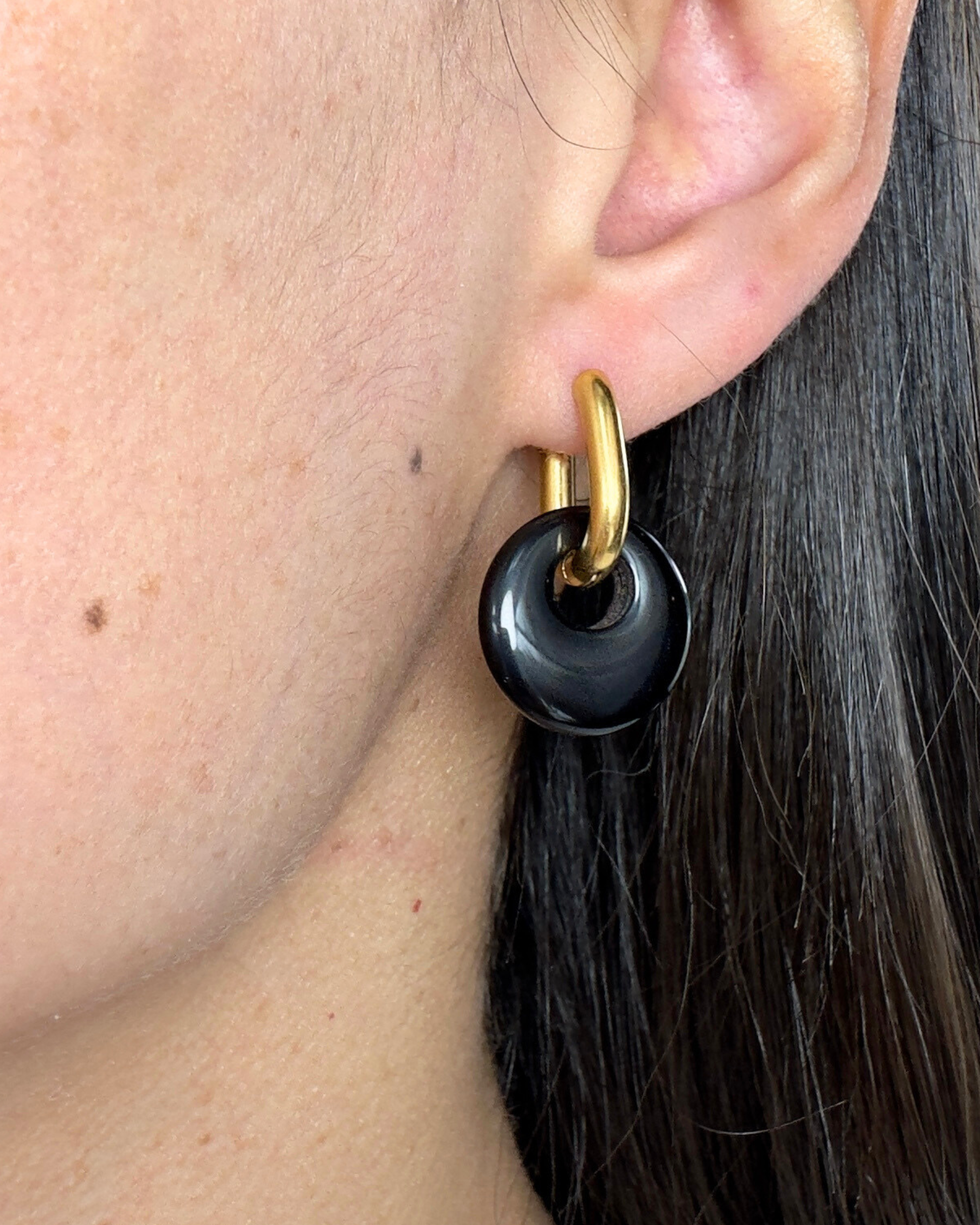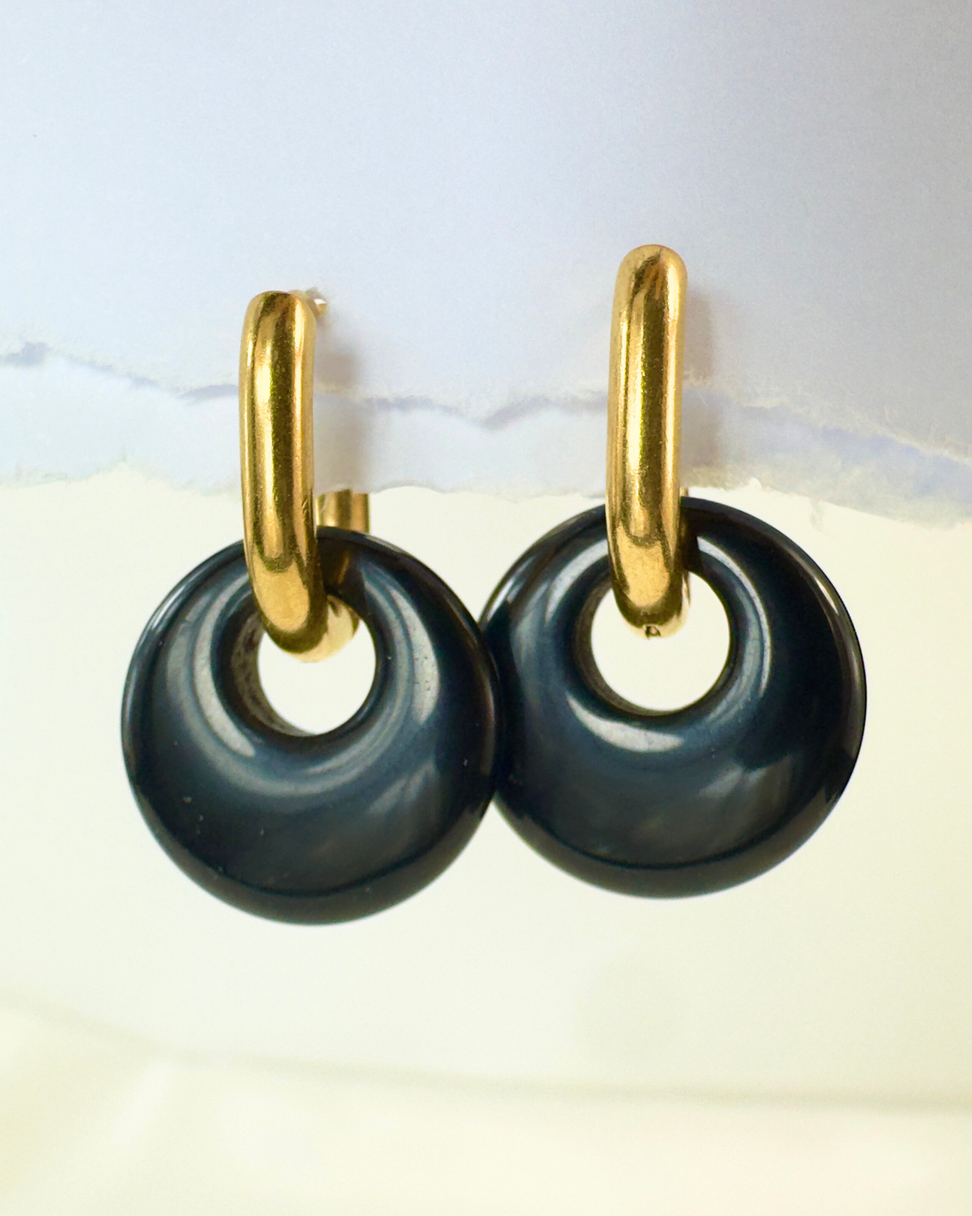 Los pendientes Círculo de Luz con Ónix simbolizan fuerza, protección y estabilidad. Este mineral oscuro te ayuda a mantenerte centrada y firme ante los desafíos, transformando la energía densa en serenidad interior.