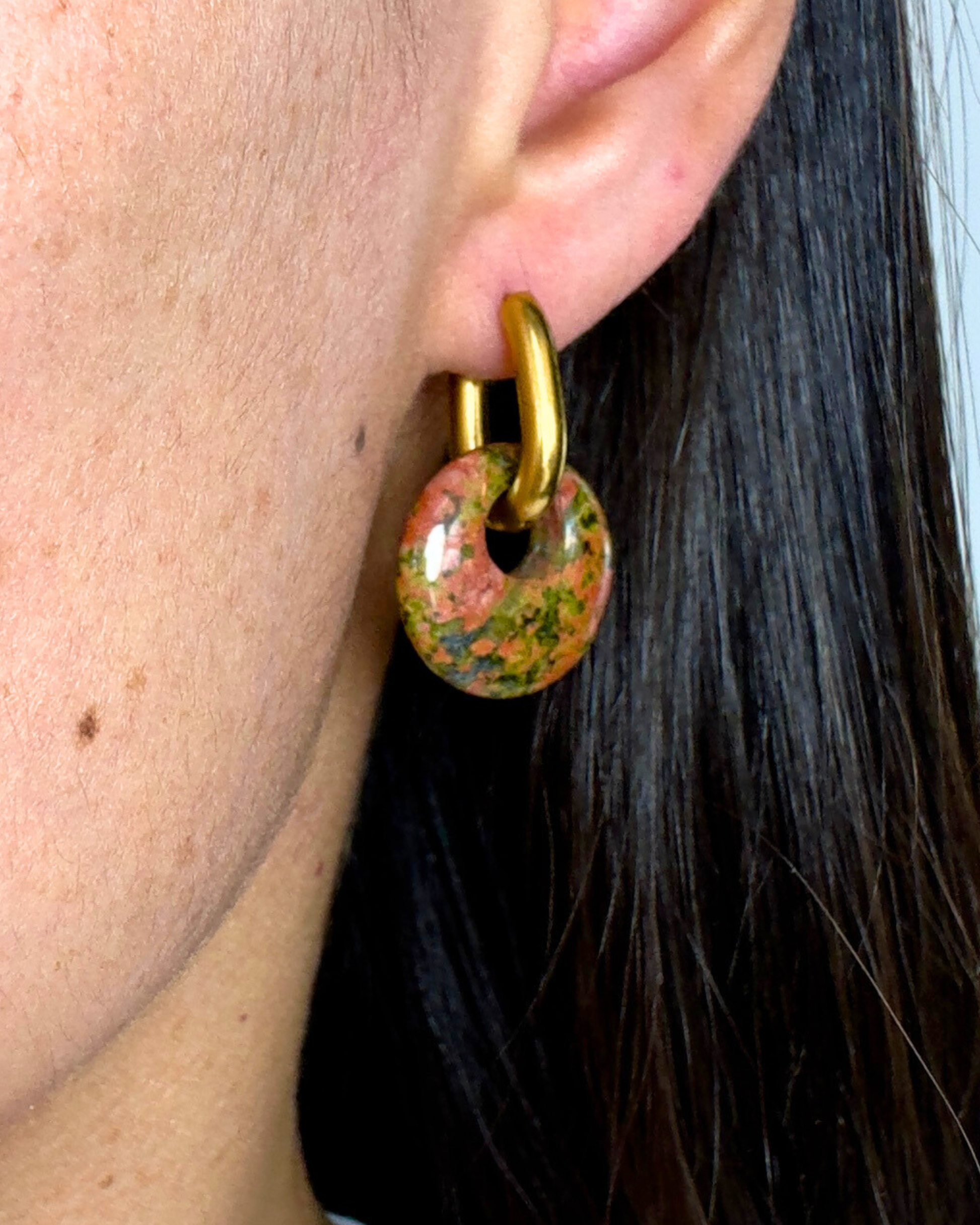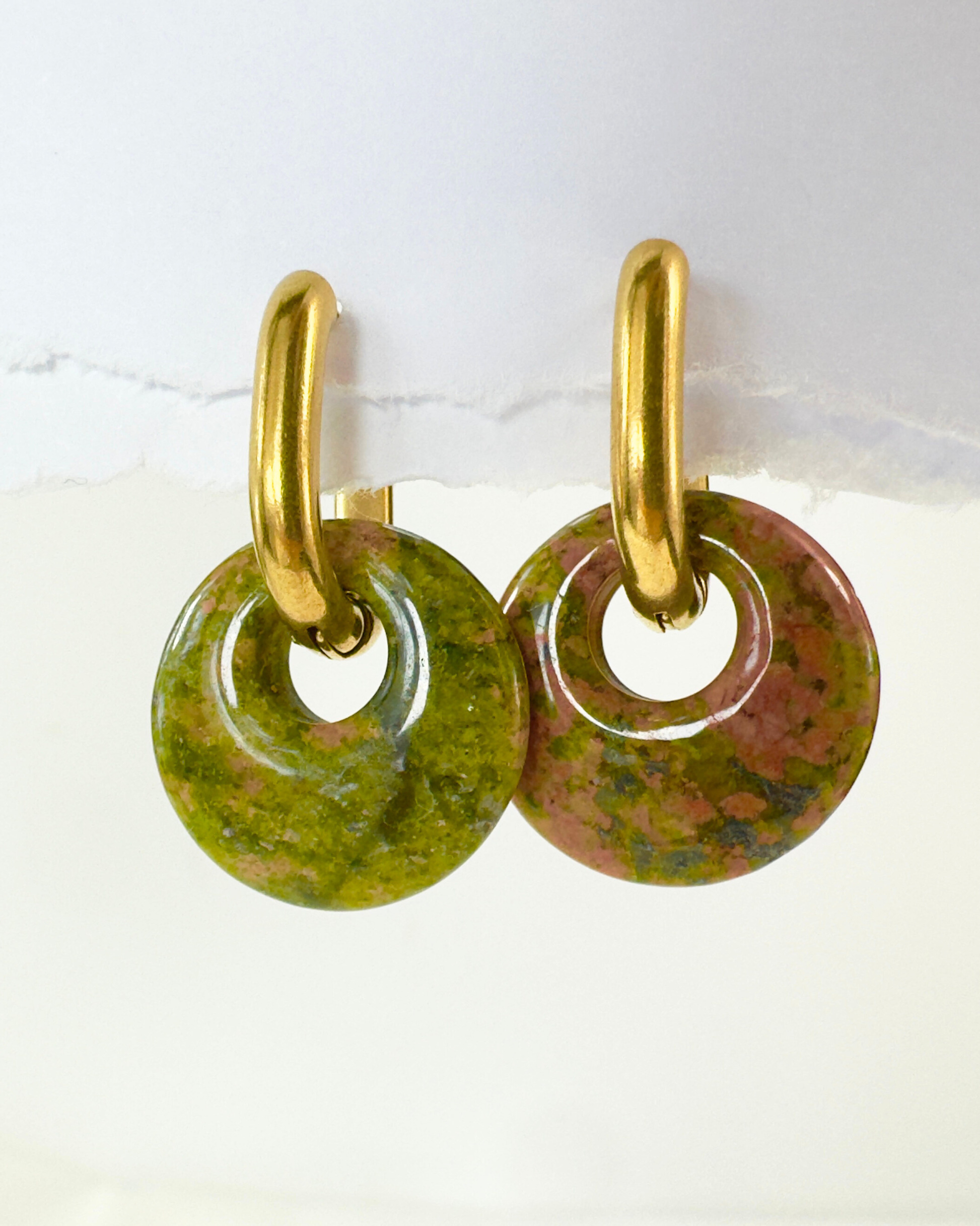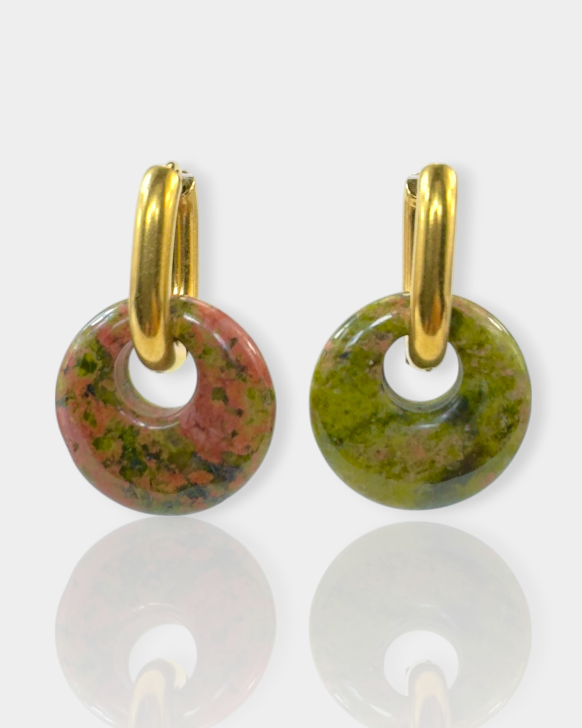 Los pendientes Círculo de Luz con Unakita te conectan con la energía del equilibrio emocional. Esta piedra combina tonos verdes y rosados que simbolizan sanación, amor y crecimiento interior.